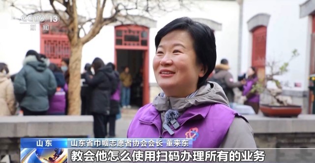 山东省巾帼志愿者协会会长 董来东:我们志愿者设计了扫码服务,也做了一个小视频,教会他怎么使用扫码办理所有的业务。